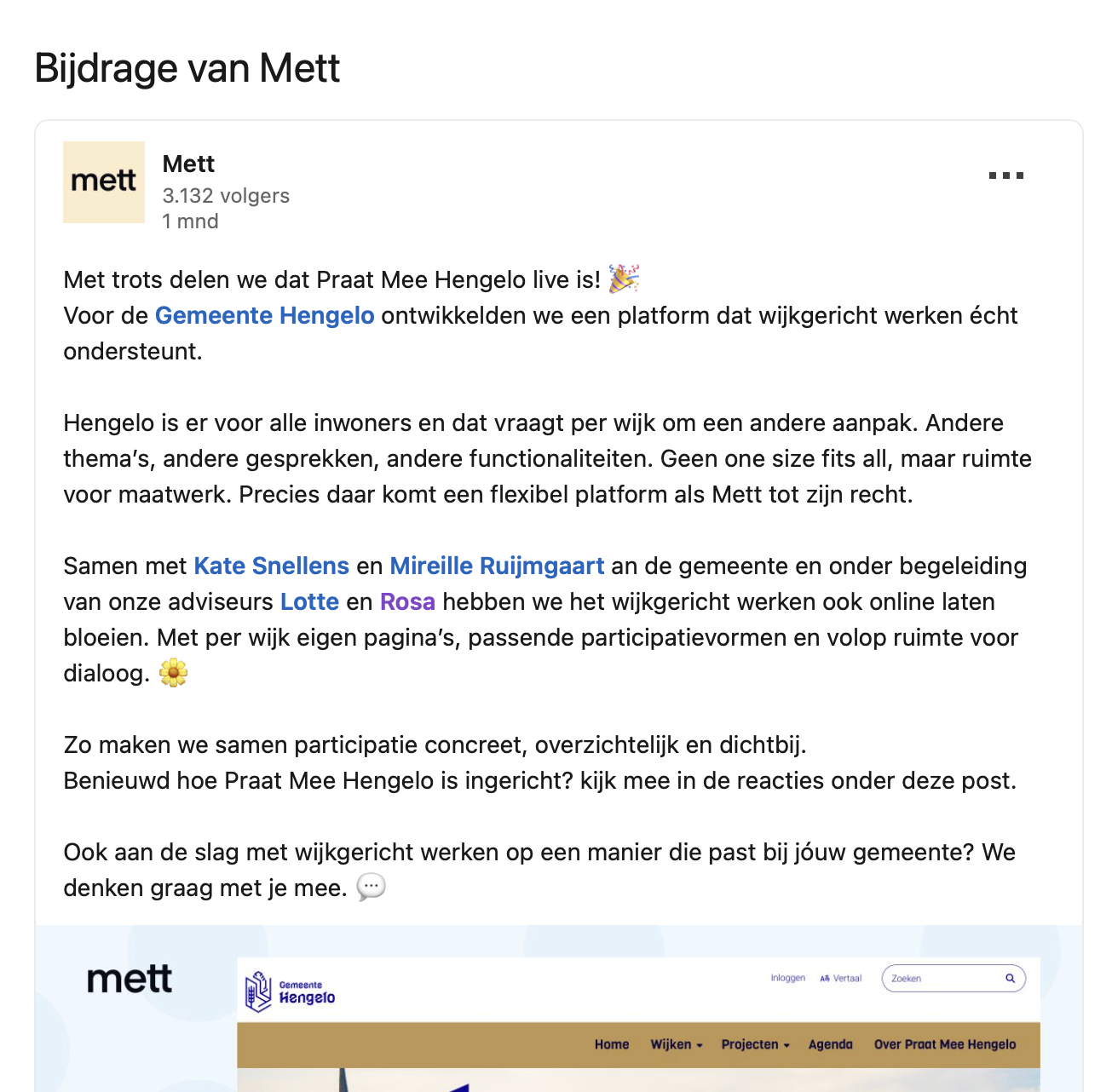 Het is een bestaand platform van het bedrijf Mett uit Utrecht, dat in maart jl. via LinkedIn de lancering van het project in Hengelo meldde. Verschillende Nederlandse gemeenten zetten het systeem in voor community-building, participatie en kennisdeling.